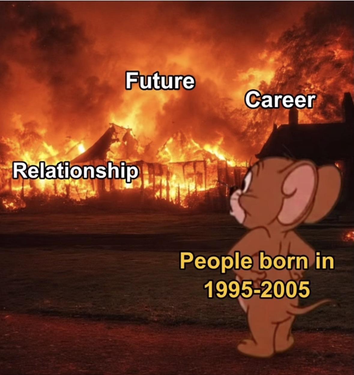 This humorous meme features Jerry Mouse watching a burning house, symbolizing the chaos of the future, career, and relationships for those born in 1995-2005.