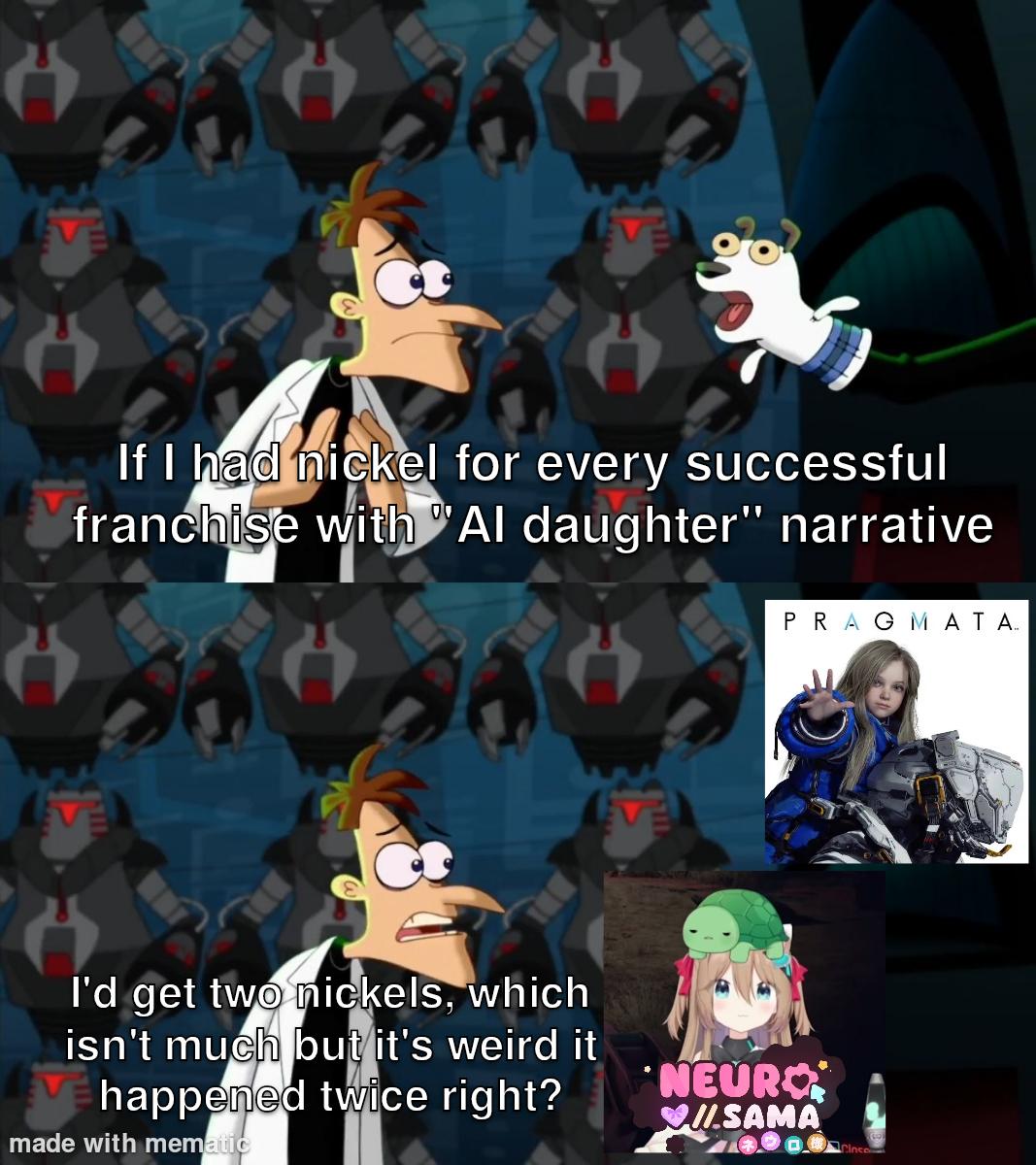 This humorous meme uses the Dr. Doofenshmirtz template to point out the recurring trope of AI daughters in media, specifically referencing Pragmata and Neuro-Sama.