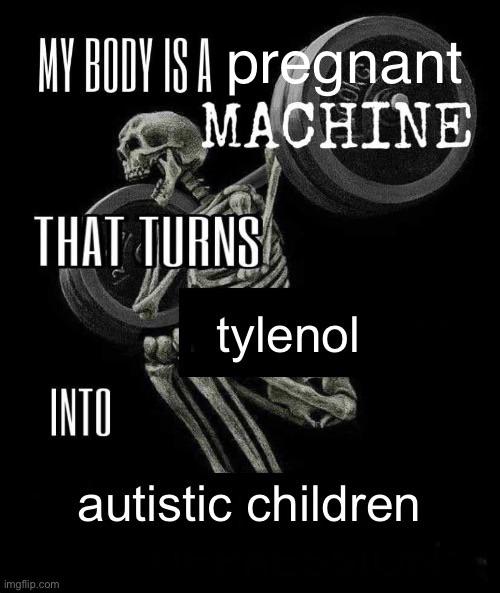 This DarkHumorMemes, ControversialMemes, EdgyMemes meme features Skeleton lifting weights with text saying 'My body is a pregnant machine that turns tylenol into autistic children' in stylized font. Created and shared on Jart.lol, this image meme represents the best of internet culture and humor.