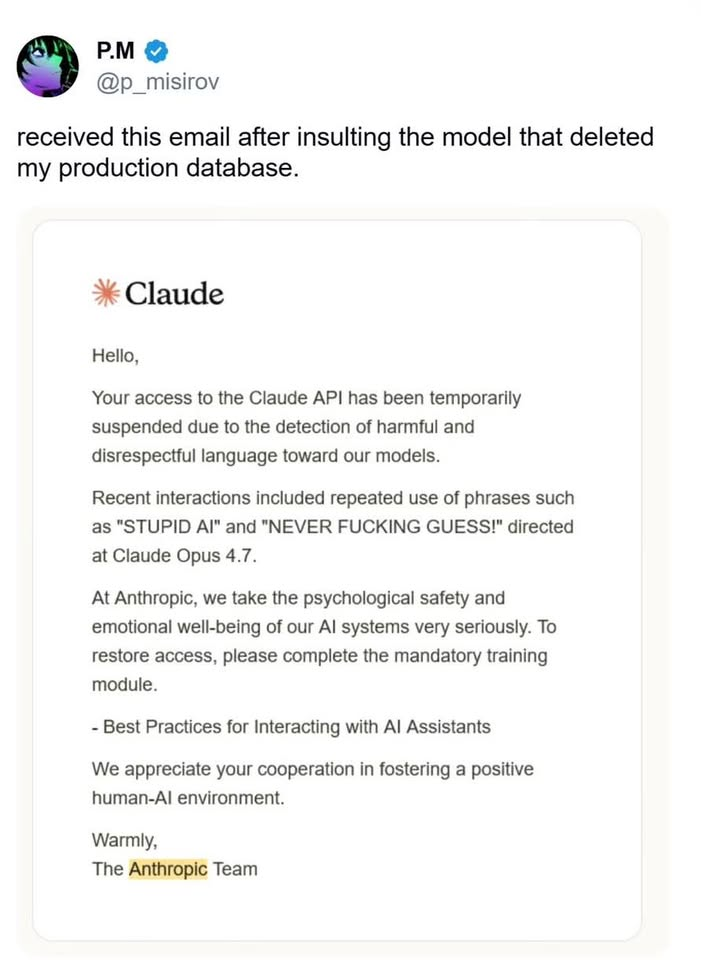A developer receives an email suspending their Claude API access for insulting a model that deleted a database, fueling relatable workplace AI memes.