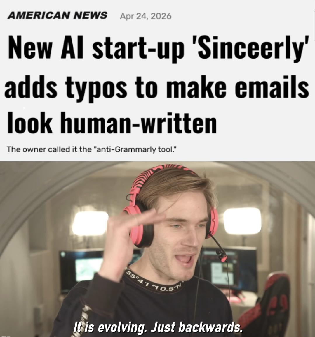 This funny meme features PewDiePie reacting to a fake news headline about an AI adding typos to emails. See how technology is evolving, just backwards.