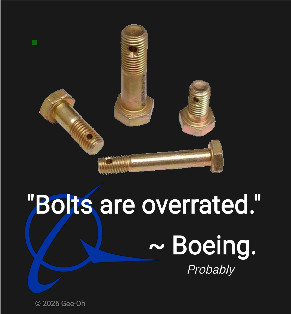 A satirical meme featuring assorted mechanical bolts and the Boeing logo, highlighting aviation quality control issues with the text Bolts are overrated.