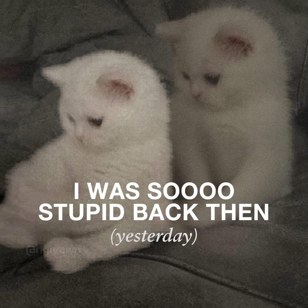 Two cute, sad-looking white kittens sit together as the text reads I was so stupid back then yesterday. This relatable meme captures feelings of regret.