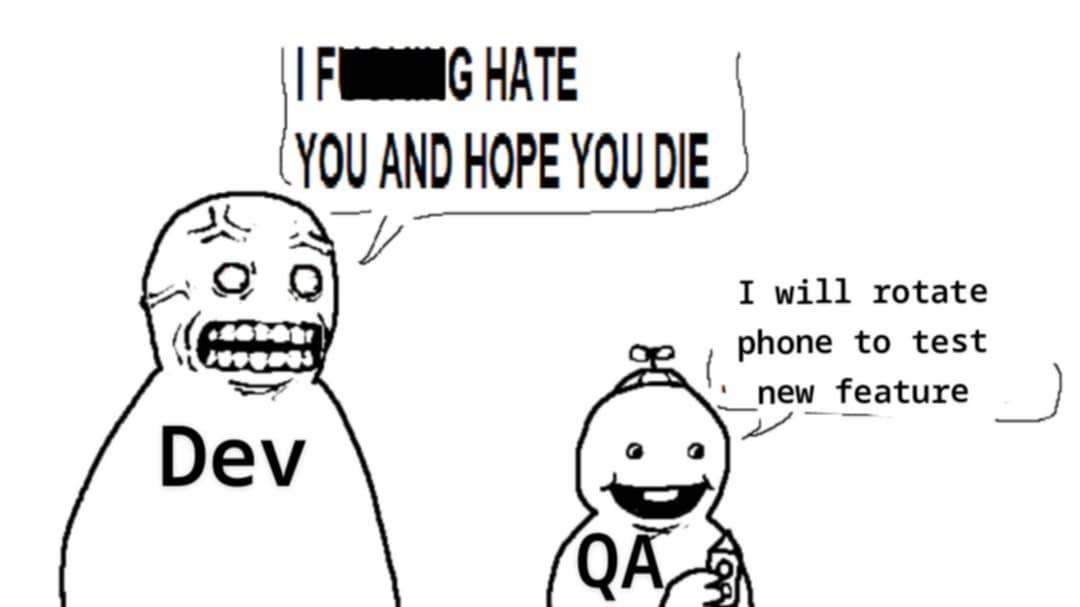 This TechMemes, WorkplaceMemes, FunnyMemes, RelatableMemes meme features Crude cartoon of a frustrated Dev character yelling 'I F***G HATE YOU AND HOPE YOU DIE' at a smiling QA character saying 'I will rotate phone to test new feature'. Created and shared on Jart.lol, this image meme represents the best of internet culture and humor.