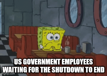 Relatable waiting meme shows SpongeBob in a diner, capturing the epic anxiety of US government shutdowns. Viral SpongeBob meme template loved by all.