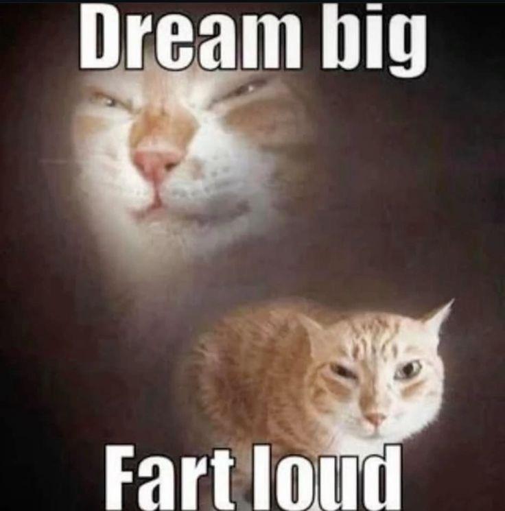 An orange cat stares intensely with the text Dream Big Fart Loud in this funny meme. This relatable animal meme encourages living your life without any shame.