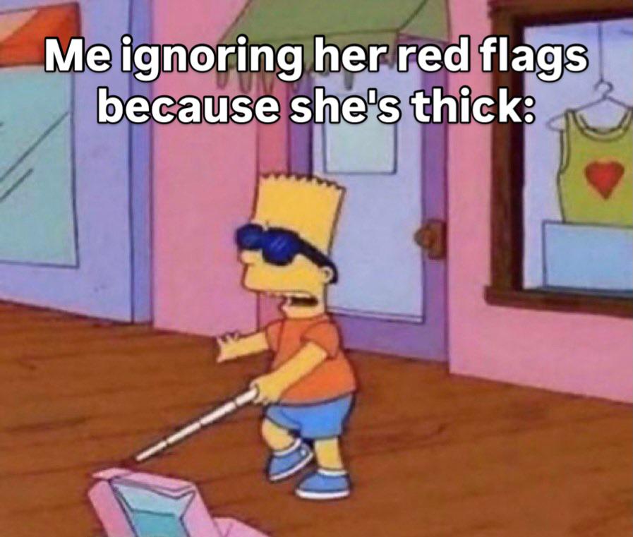 #relatable #funny #bart simpson #red flags #dating humor #relationship memes #cartoon #blind to red flags #the simpsons #reaction image #dating life #satire