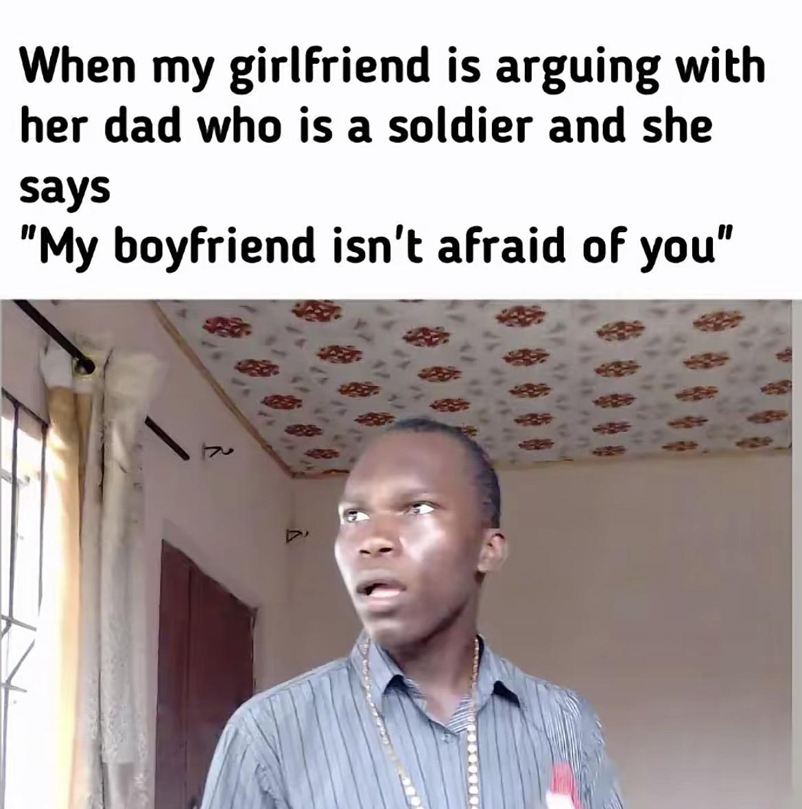 A relatable meme showing a man looking terrified after his girlfriend claims he is not afraid of her father, who happens to be a soldier in the military.