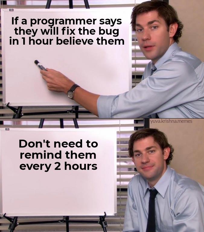 This FunnyMemes, ProgrammingMemes, OfficeMemes, RelatableMemes meme features Two panel meme with a man in an office pointing to a whiteboard. Top text: 'If a programmer says they will fix the bug in 1 hour believe them.' Bottom text: 'Don't need to remind them every 2 hours.'. Created and shared on Jart.lol, this image meme represents the best of internet culture and humor.