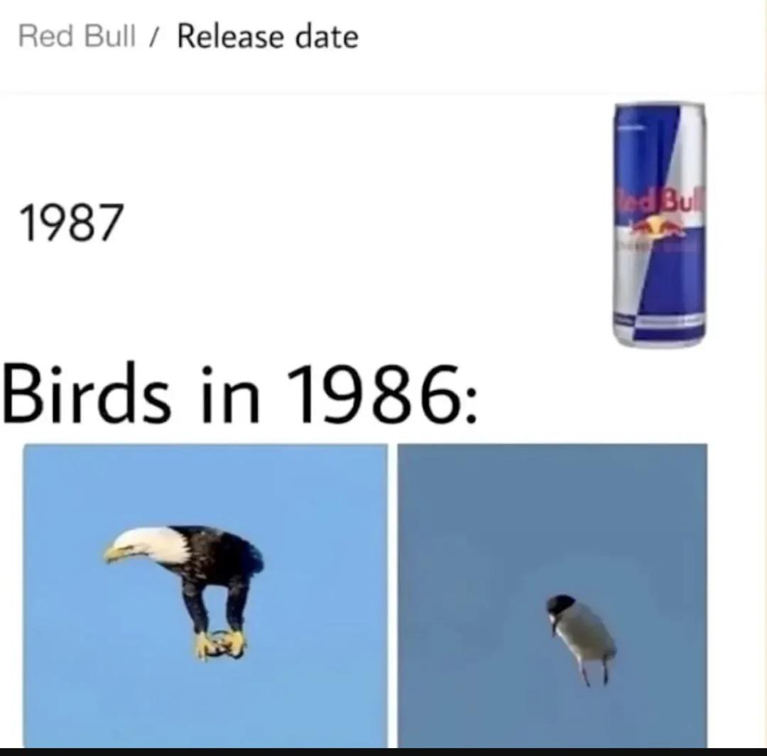 A funny meme comparing the 1987 release date of Red Bull to birds in 1986, showing them falling from the sky before energy drinks existed to grant them wings.