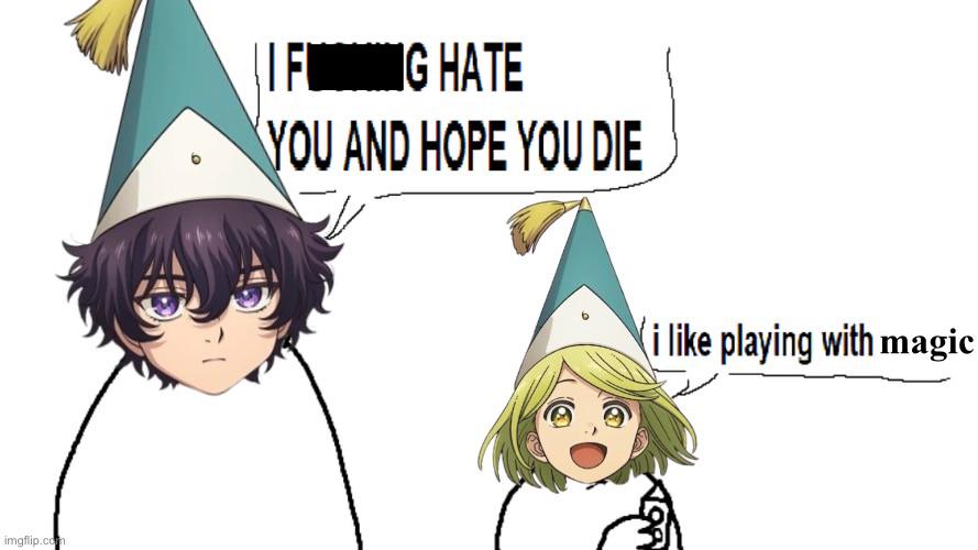 A funny meme featuring two anime characters in party hats with contrasting attitudes. One expresses extreme hatred while the other innocently likes magic.