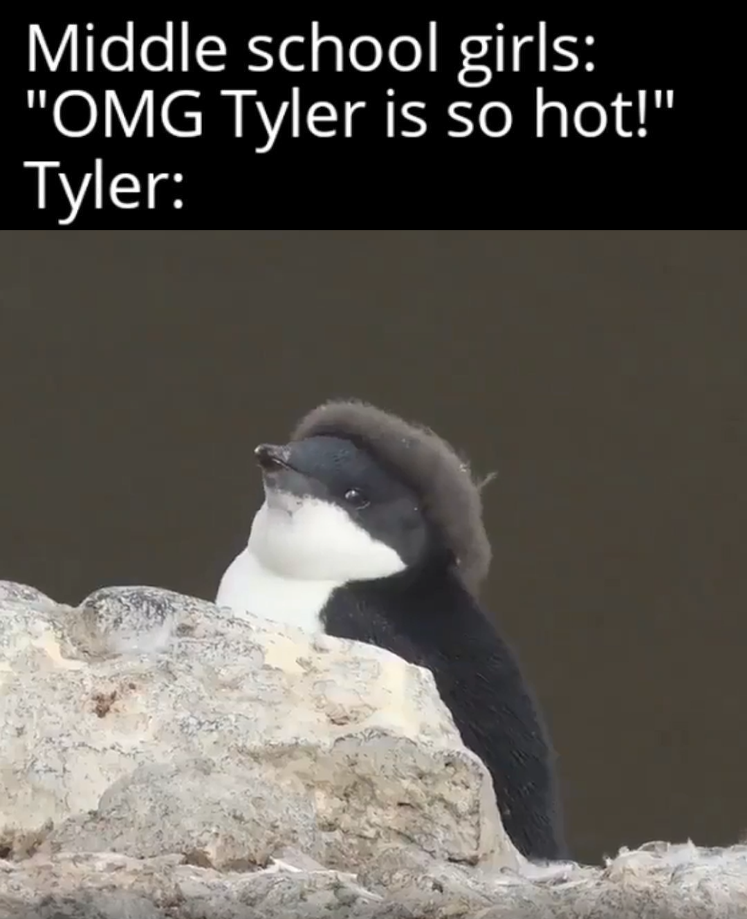 This funny meme contrasts the high expectations of middle school girls with the awkward appearance of a bird with a messy hairdo representing Tyler.