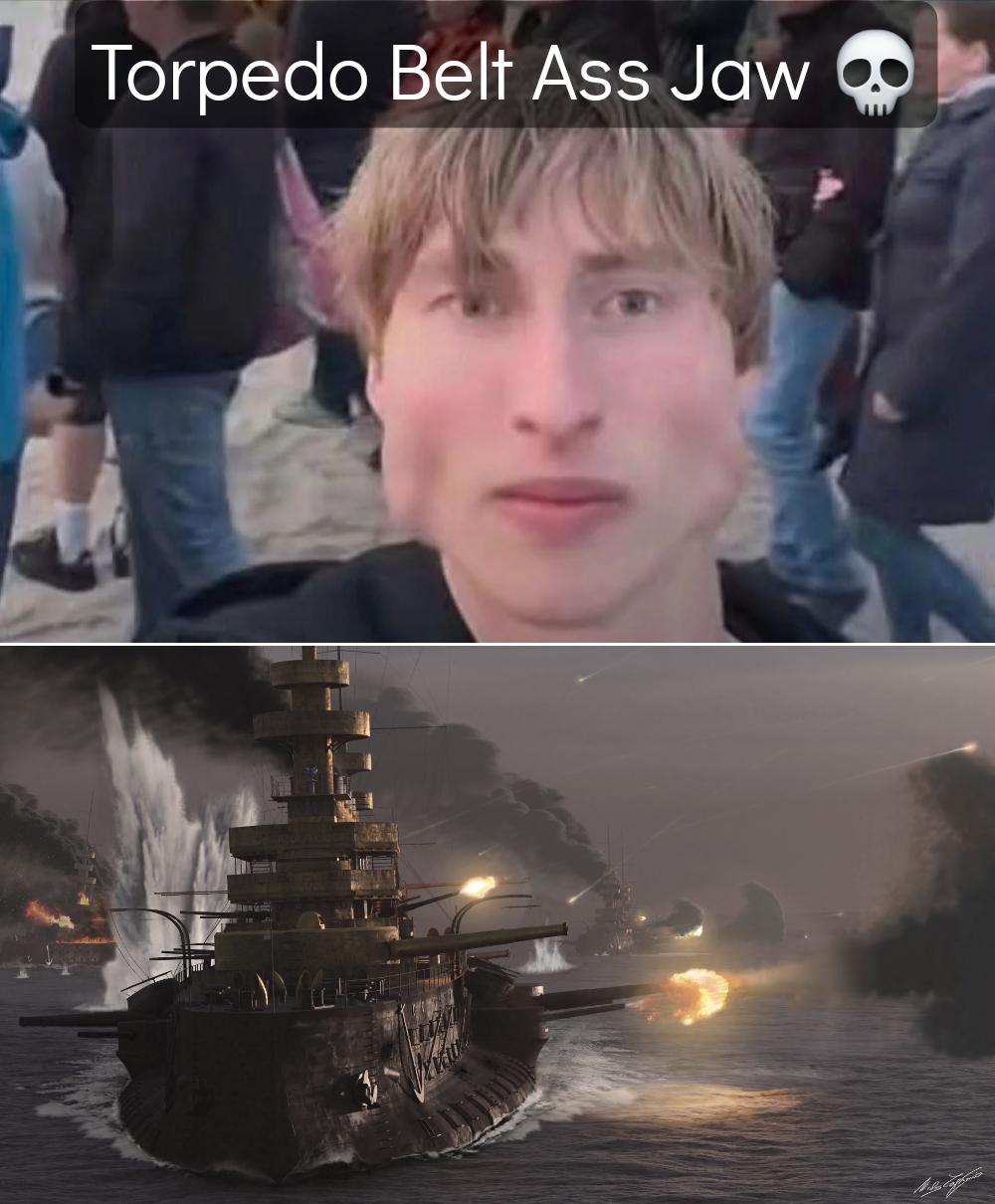 This comparison meme humorously links a man with a distinctively wide jawline to the heavy torpedo belt armor found on historic naval battleships.