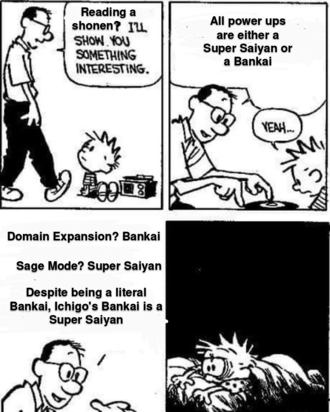 This Calvin and Hobbes meme explores how shonen anime power ups are just variations of Bankai or Super Saiyan, sparking funny debates among anime fans.