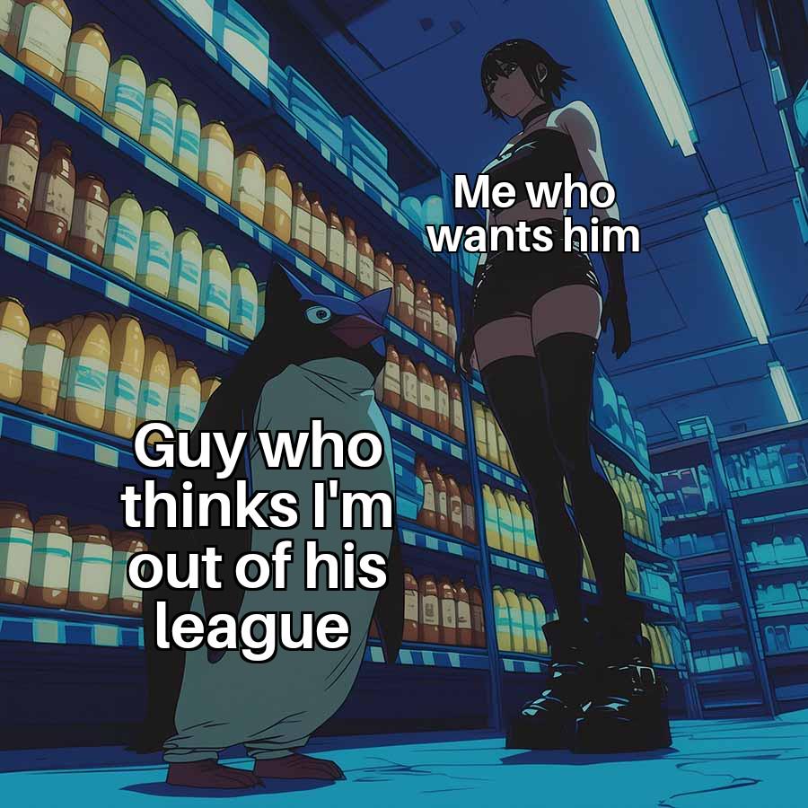 This FunnyMemes, ReactionMemes, AnimeMemes meme features Anime supermarket scene with shelves of bottles. A tall woman in a black outfit stands towering over a short penguin-like character. White on-image text reads 'Me who wants him' over the woman and 'Guy who thinks I'm out of his league' over the penguin.. Created and shared on Jart.lol, this image meme represents the best of internet culture and humor.