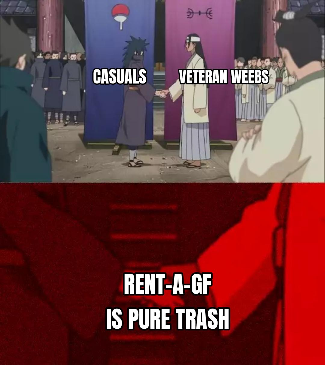 This Naruto handshake meme shows casual viewers and veteran weebs finding common ground to agree that the anime series Rent-A-Girlfriend is absolute trash.