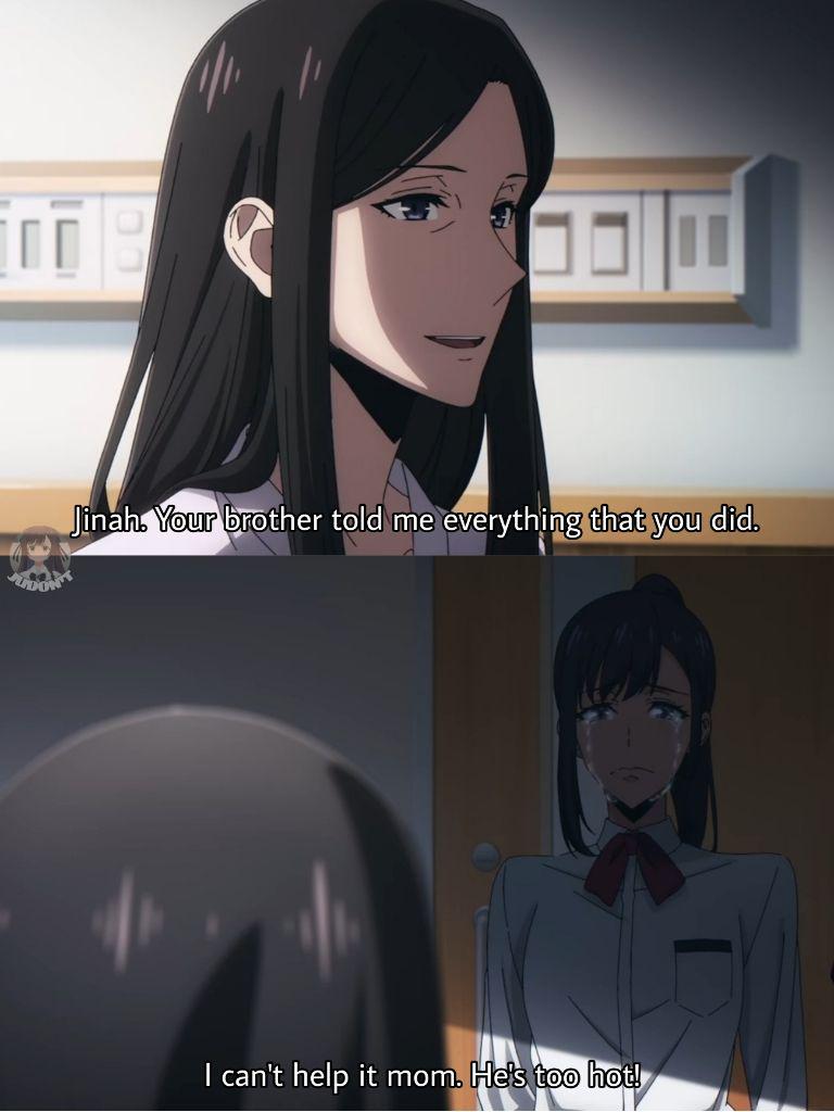This FunnyMemes, ReactionMemes, AnimeMemes meme features Two-panel anime scene. Top panel: long black-haired woman smiles, text reads "Jinah. Your brother told me everything that you did." Bottom panel: crying schoolgirl in uniform with bow, teary eyes, text reads "I can't help it mom. He's too hot!". Created and shared on Jart.lol, this image meme represents the best of internet culture and humor.
