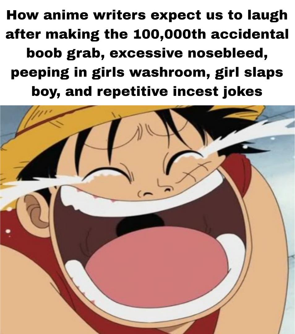 This relatable anime meme features Monkey D. Luffy laughing at the repetitive and tired comedy tropes frequently found in modern Japanese animation shows.