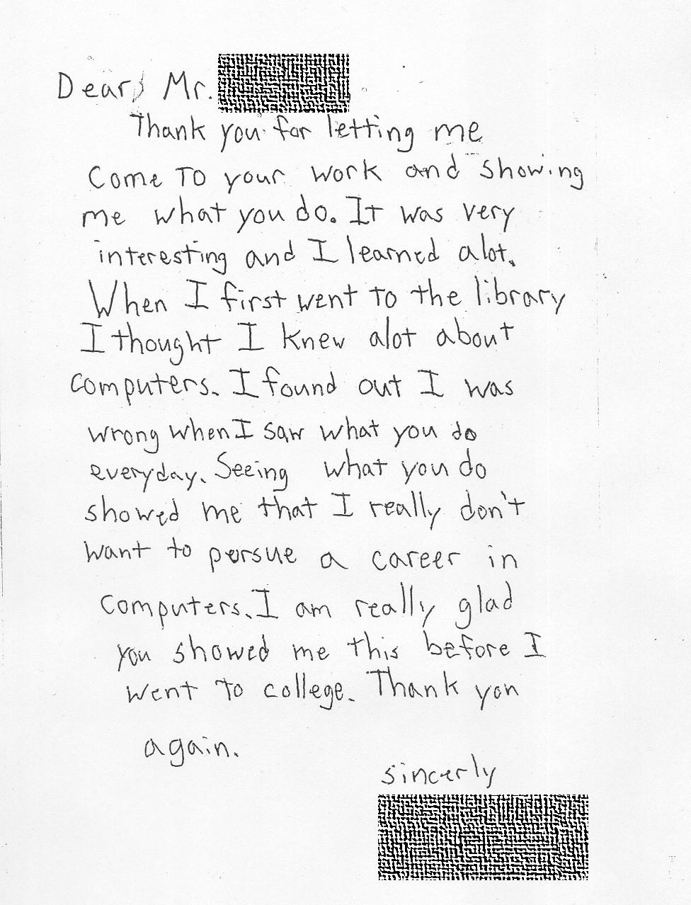 A handwritten letter from a student to a computer professional, explaining that witnessing their daily work convinced them to avoid a career in computing.