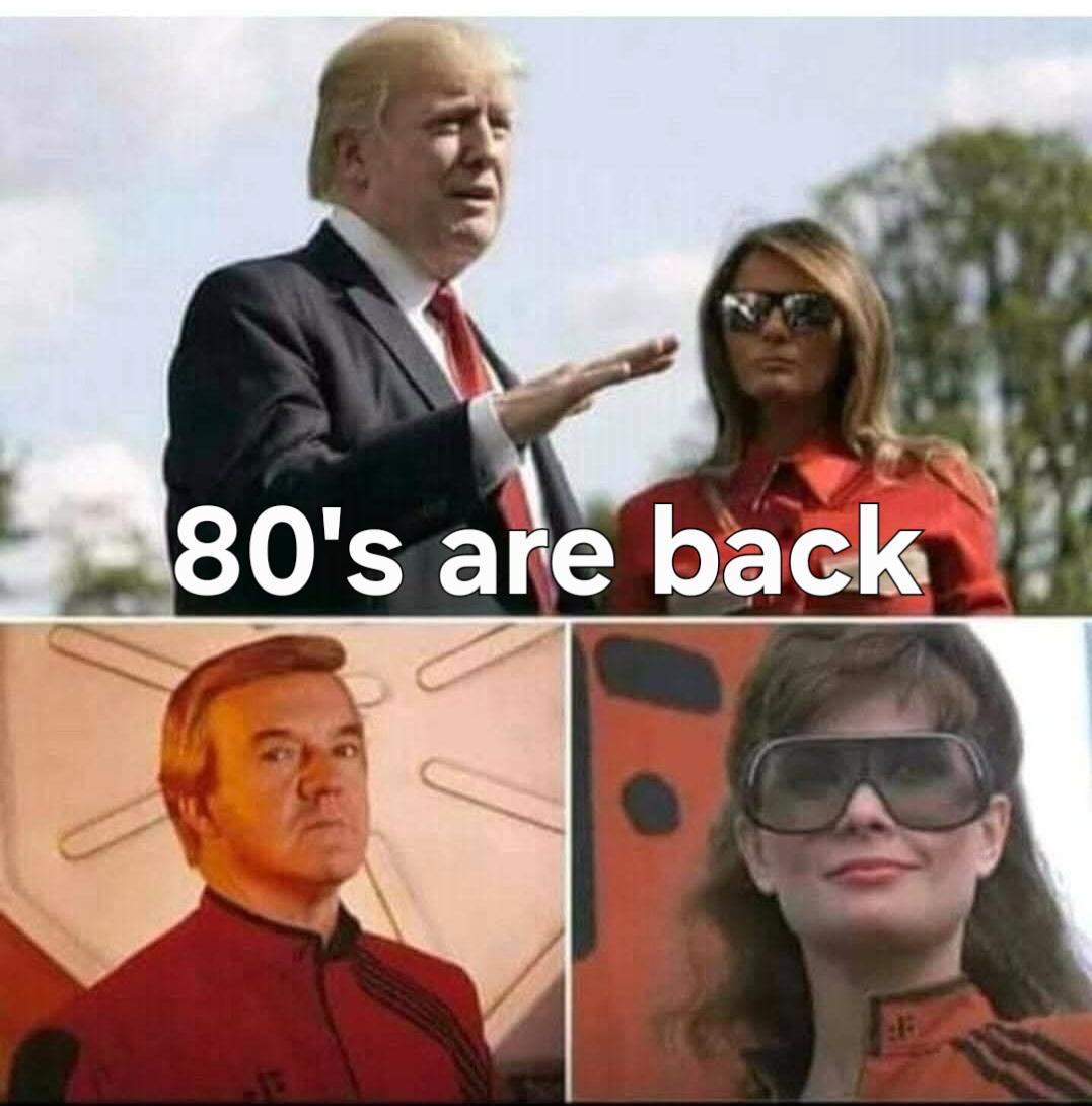 This FunnyMemes, ReactionMemes, PoliticalMemes, NostalgiaMemes meme features Top panel: a man in a dark suit gestures with his hand while a woman in sunglasses and a red outfit stands beside him. White overlaid text reads "80's are back". Bottom panels: two people wearing retro red uniforms, one with large tinted goggles, posed in a sci-fi style set.. Created and shared on Jart.lol, this image meme represents the best of internet culture and humor.