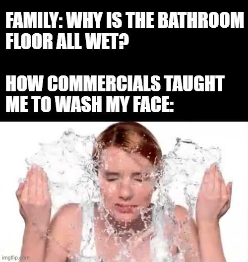 Relatable bathroom meme shows why the floor gets soaked. This meme nails how commercials exaggerate washing your face with epic water splashes. Viral memes gold.