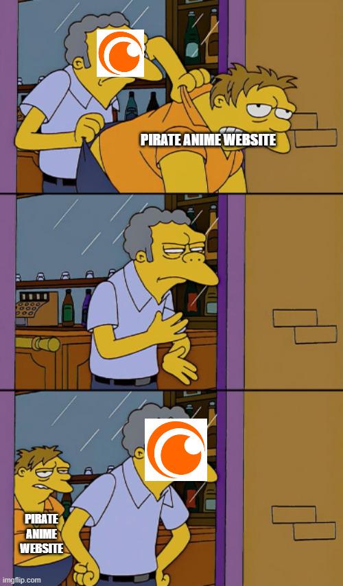 A Simpsons meme showing Crunchyroll throwing a pirate anime website out, only for the site to return immediately. A classic take on anime streaming memes.