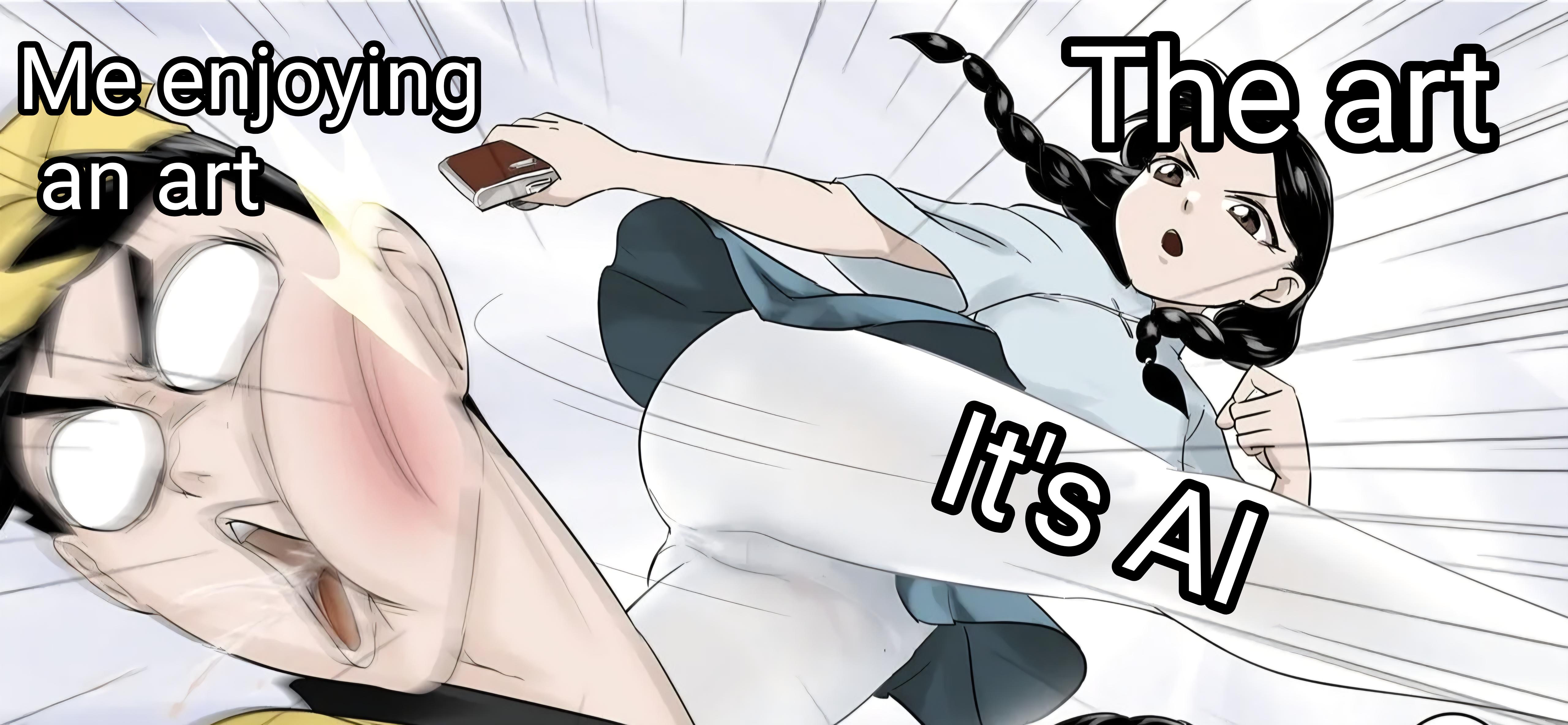 An anime girl kicks a man in the face, representing the shock of discovering that art you enjoy was actually created using AI, a popular trending meme.