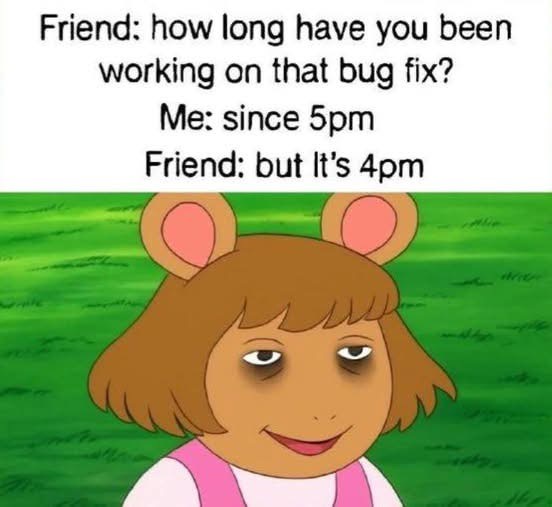 This FunnyMemes, WorkMemes, ProgrammingMemes, RelatableMemes meme features Cartoon character D.W. from Arthur with tired eyes, captioned: Friend: how long have you been working on that bug fix? Me: since 5pm. Friend: but it's 4pm. Created and shared on Jart.lol, this image meme represents the best of internet culture and humor.