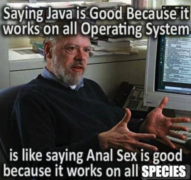 This TechMemes, FunnyMemes, ProgrammingMemes meme features A man with a beard gesturing while sitting at a desk in front of a computer. Text reads: 'Saying Java is good because it works on all operating systems is like saying anal sex is good because it works on all species.'. Created and shared on Jart.lol, this image meme represents the best of internet culture and humor.