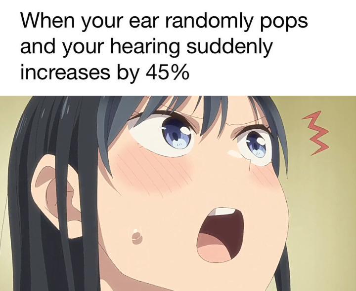 When your ear pops: this relatable anime reaction meme shows sudden 45% super-hearing. Viral memes perfect for reaction posts, funny shares and social content.