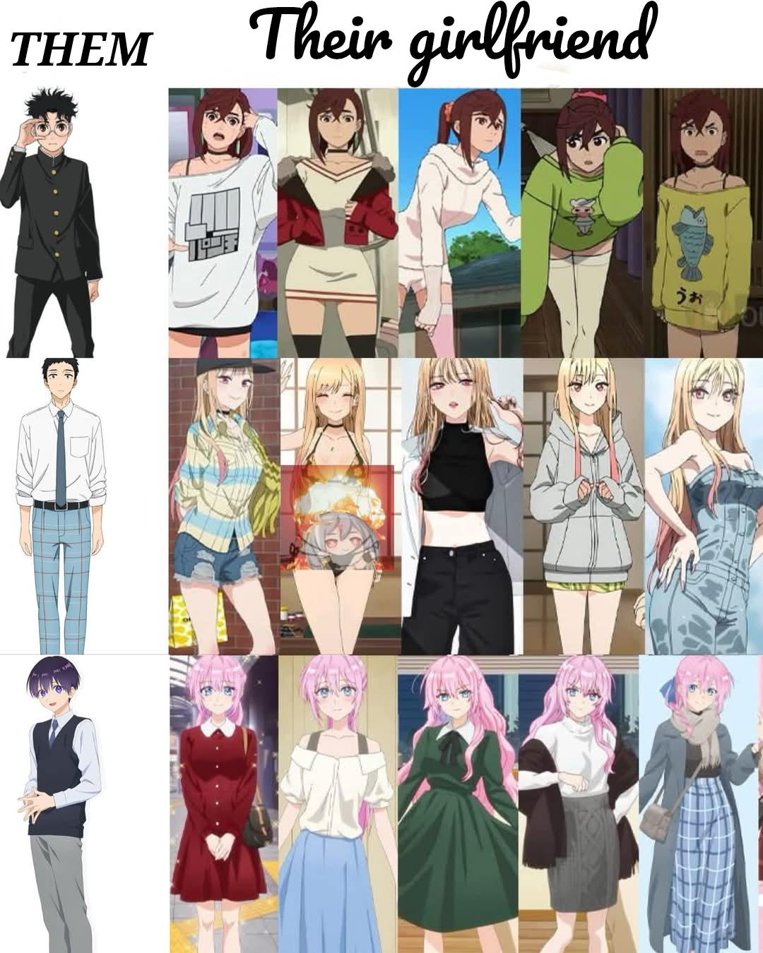 This FunnyMemes, AnimeMemes, ReactionMemes, ComparisonMemes meme features Top left word 'THEM' above three vertical anime boys: a black-haired student in a black uniform adjusting glasses, a tidy man in a white shirt and tie with checked pants, and a purple-haired young man in a vest and slacks. Across the top center in script reads 'Their girlfriend'. To the right is a 3x5 grid of different anime girls: rows of brown-haired, blonde, and pink-haired girls wearing varied outfits (oversized sweaters, hoodies, dresses, crop tops, skirts, denim). The image contrasts plain male avatars on the left with many stylish anime girlfriends on the right.. Created and shared on Jart.lol, this image meme represents the best of internet culture and humor.