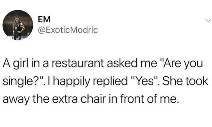A relatable Twitter meme about a man who thinks he is being hit on at a restaurant, only to realize the server just wanted the extra chair at his table.