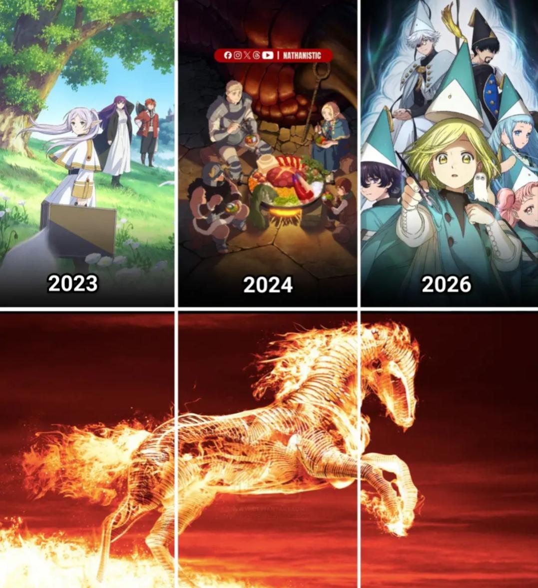 This comparative meme tracks popular anime titles from 2023 to 2026 using the flaming horse sketch format to highlight the intensity of recent releases.