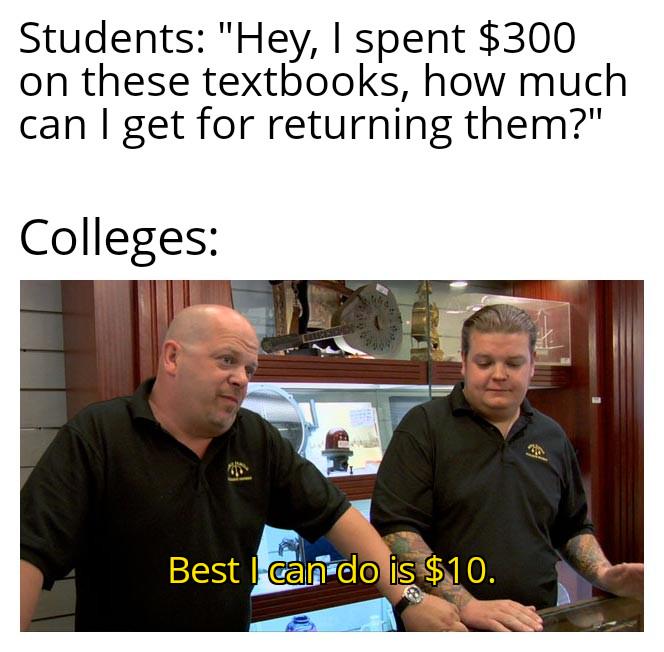 Relatable college meme about expensive textbook buybacks. Features Pawn Stars meme template. Perfect for viral memes about student struggles and college humor.