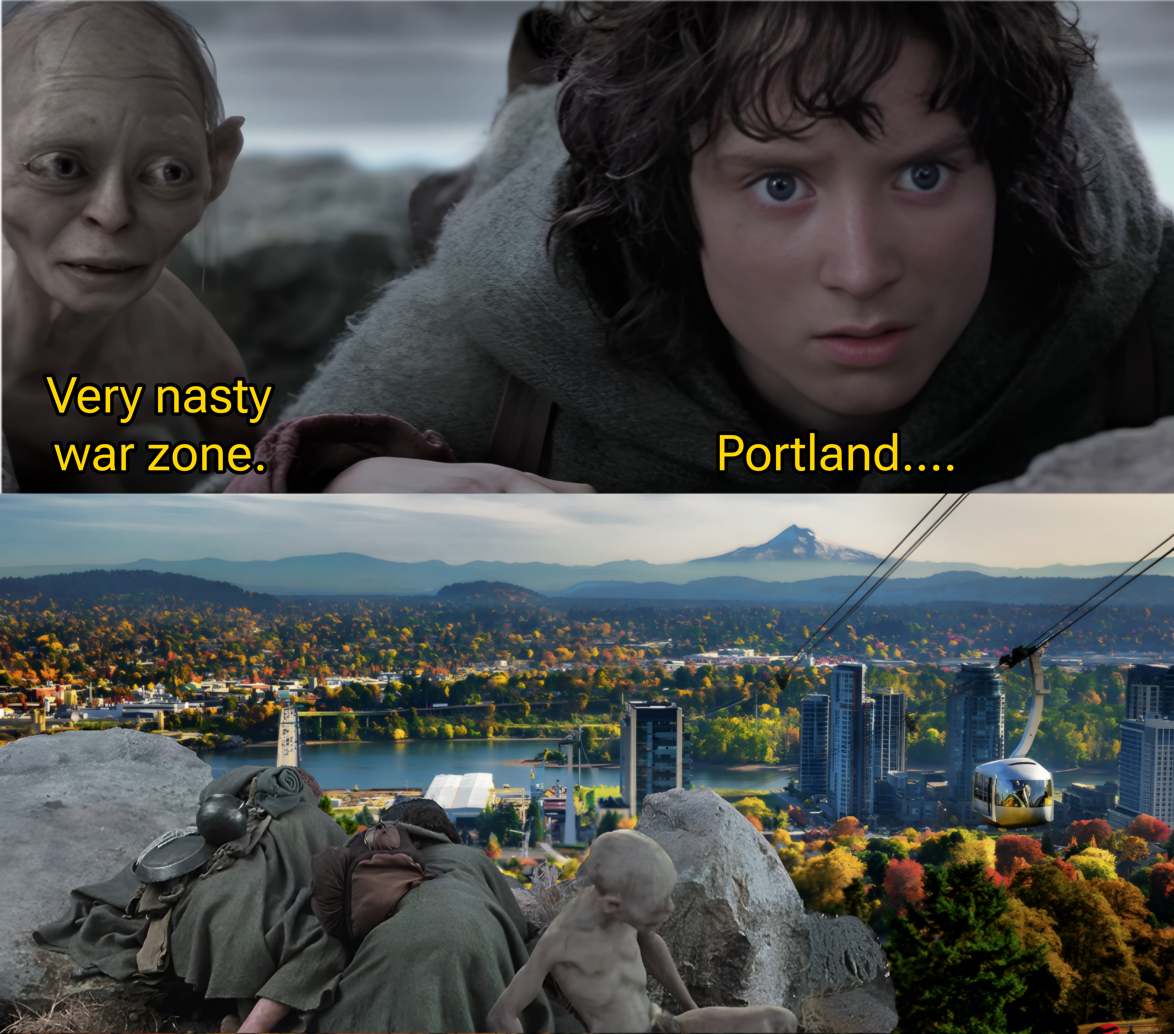 Epic Lord Of The Rings meme shows Frodo and Gollum mistaking scenic Portland for a war zone. This hilarious viral meme blends movie humor and city jokes.