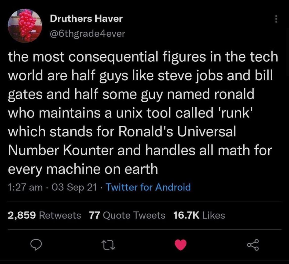 This FunnyMemes, TechMemes, DeveloperMemes, RelatableMemes meme features Screenshot of a tweet by Druthers Haver joking about tech icons like Steve Jobs and Bill Gates versus a fictional Ronald who maintains a unix tool called 'runk'.. Created and shared on Jart.lol, this image meme represents the best of internet culture and humor.