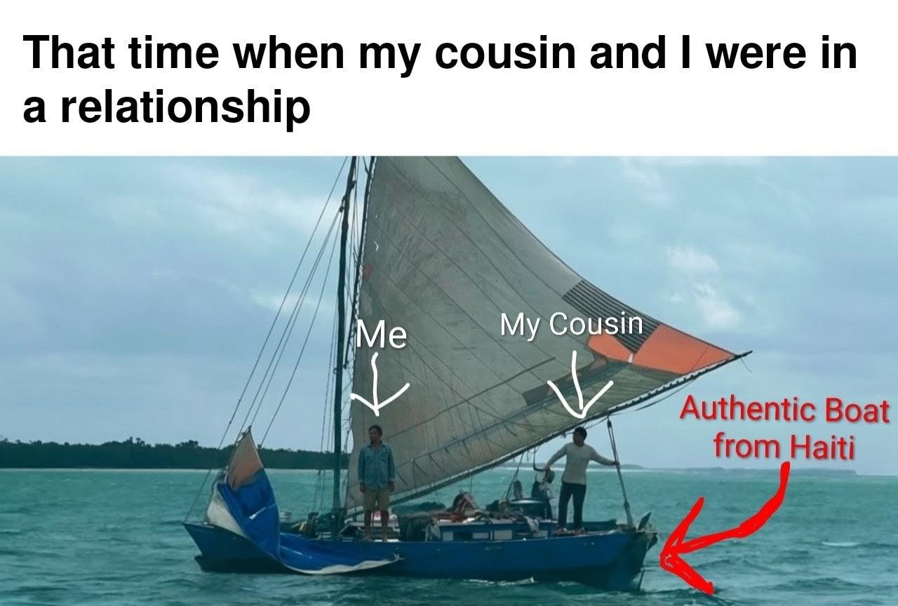 This FunnyMemes, RelatableMemes, DarkHumorMemes meme features Top text: 'That time when my cousin and I were in a relationship'. Photo of a small blue sailboat on greenish sea under cloudy sky. Two people stand on deck labeled with white text and arrows: 'Me' pointing to left person and 'My Cousin' pointing to right person. Red text on right reads 'Authentic Boat from Haiti' with a red arrow pointing to the boat's bow.. Created and shared on Jart.lol, this image meme represents the best of internet culture and humor.
