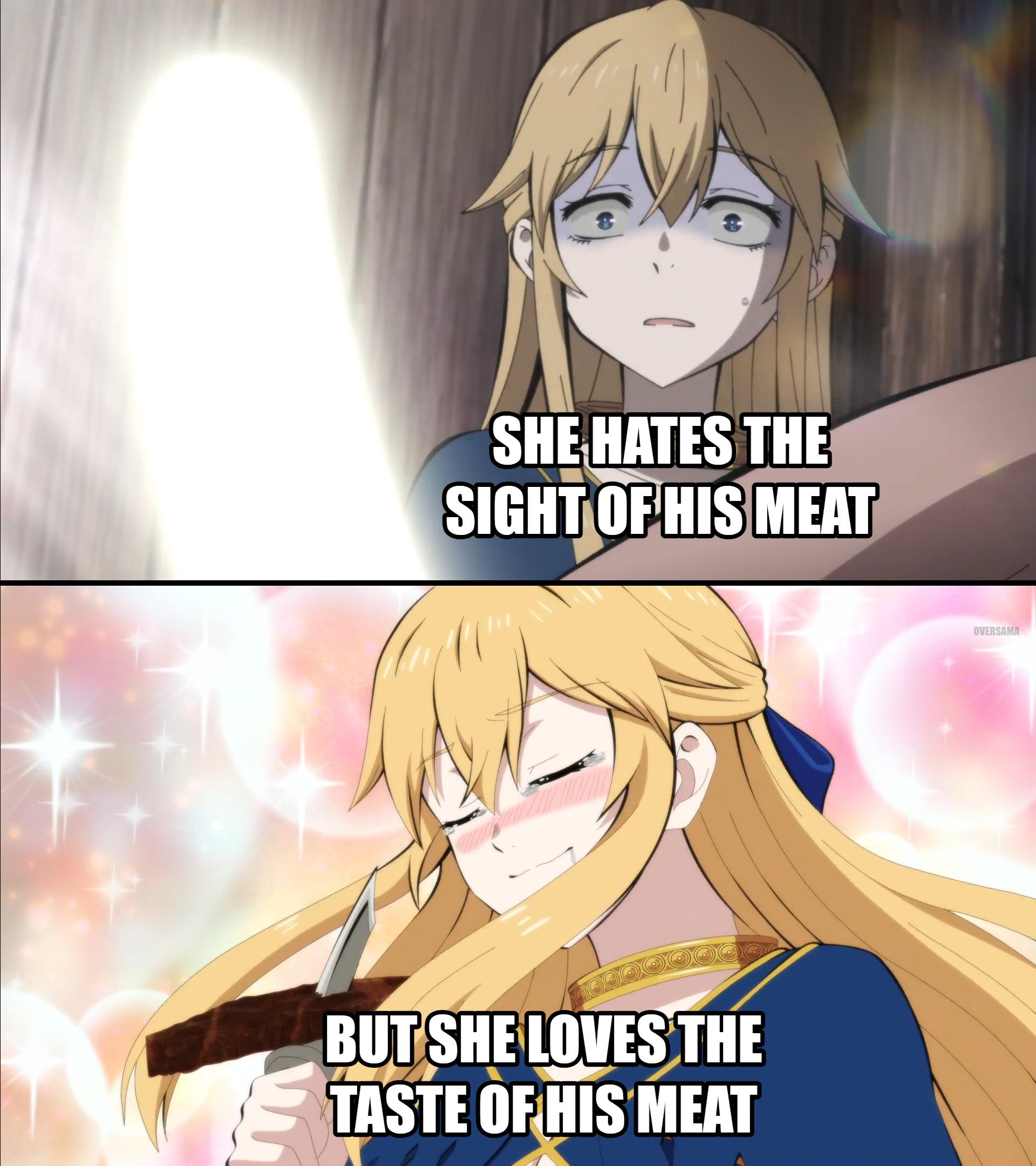 A two-panel anime meme showing a girl showing disgust followed by pure joy while eating a piece of meat. This suggestive anime humor is a popular meme.