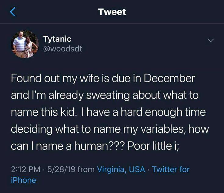 This FunnyMemes, ProgrammingMemes, TweetMemes meme features Screenshot of tweet: Found out my wife is due in December and I'm already sweating about what to name this kid. I have a hard enough time deciding what to name my variables, how can I name a human??? Poor little i;. Created and shared on Jart.lol, this image meme represents the best of internet culture and humor.