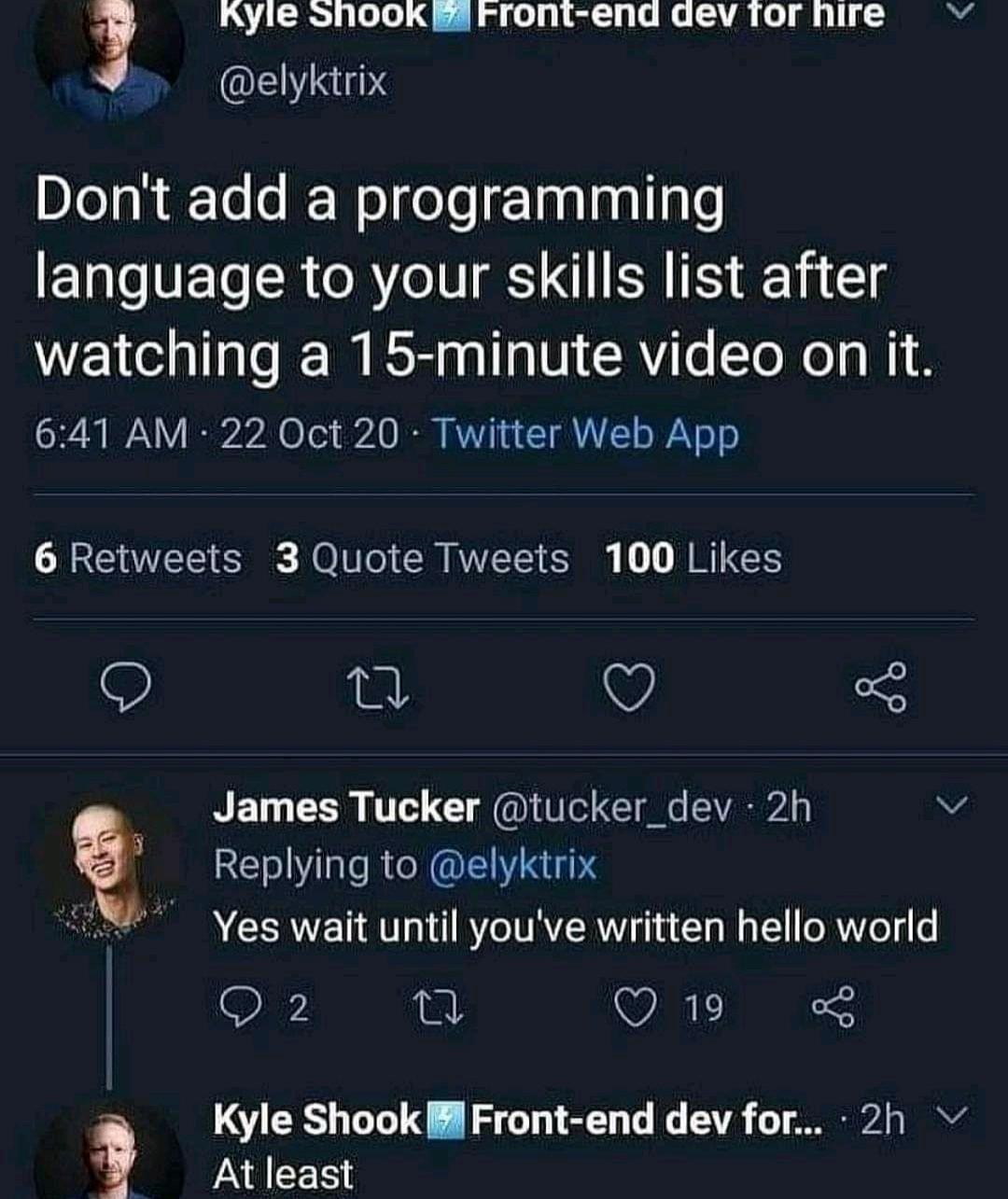This FunnyMemes, ProgrammingMemes, TwitterMemes, RelatableMemes meme features Screenshot of a Twitter conversation. First tweet: 'Don't add a programming language to your skills list after watching a 15-minute video on it.' Reply: 'Yes wait until you've written hello world.' Second reply: 'At least'.. Created and shared on Jart.lol, this image meme represents the best of internet culture and humor.