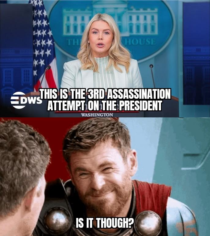 A press secretary announces a third assassination attempt, while Thor Skeptical meme responds with a doubtful Is It Though? for this political humor meme.
