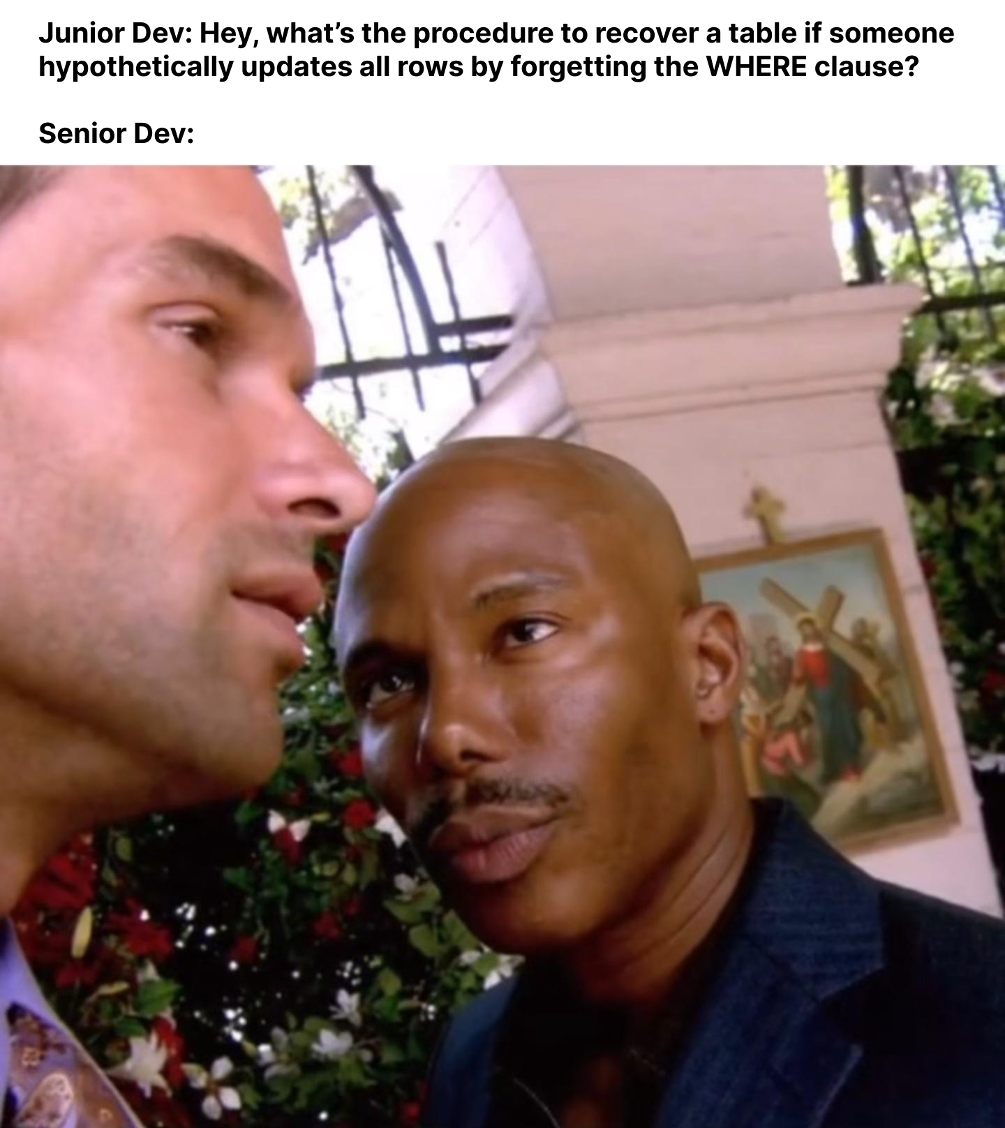 This FunnyMemes, ReactionMemes, ProgrammingMemes, WorkplaceMemes meme features Meme with two men close together, one whispering to the other, text reads Junior Dev asks about recovering a table after forgetting the WHERE clause, Senior Dev listens silently. Created and shared on Jart.lol, this image meme represents the best of internet culture and humor.