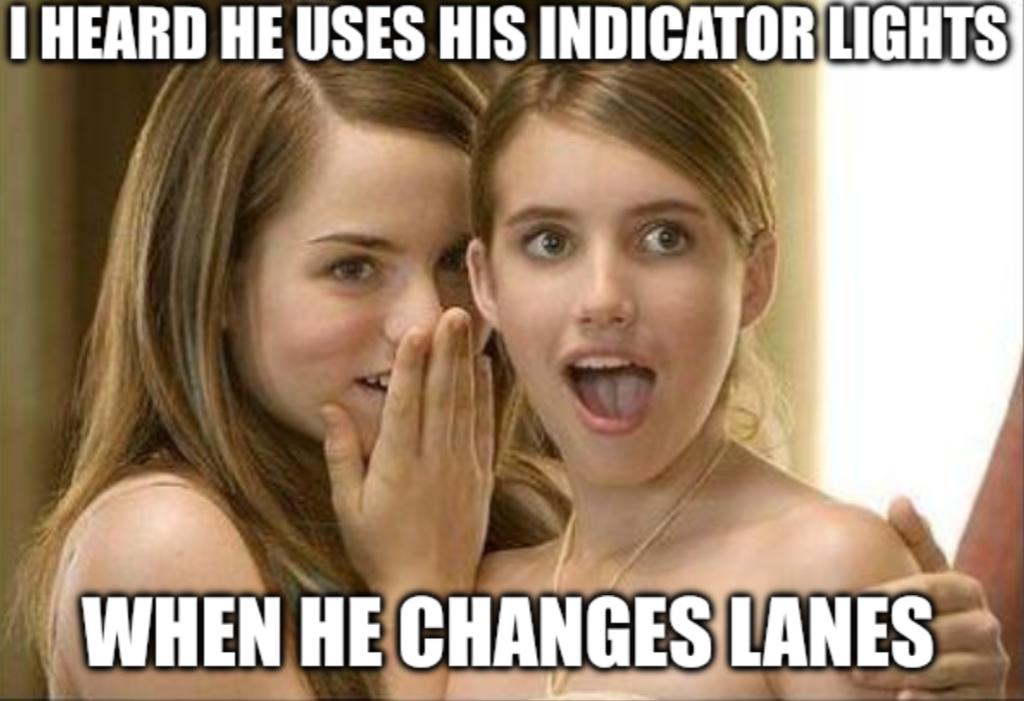 Two girls whispering a shocking secret in this classic meme template. This funny take highlights the rare and surprising act of using car indicator lights.
