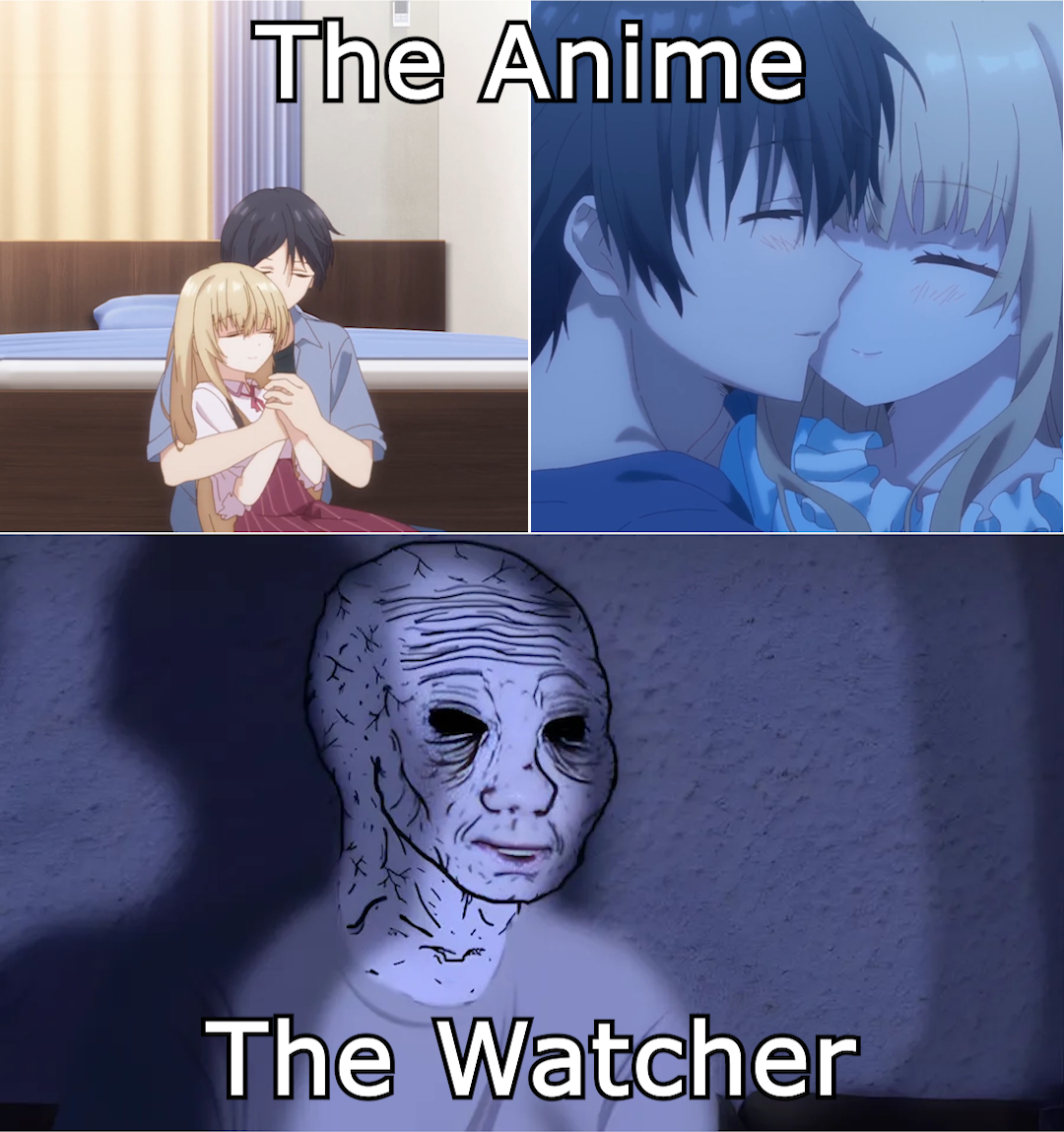 This comparison meme contrasts a sweet anime romantic scene with a lonely watcher using the depressed Wojak character to highlight the viewer's isolation.