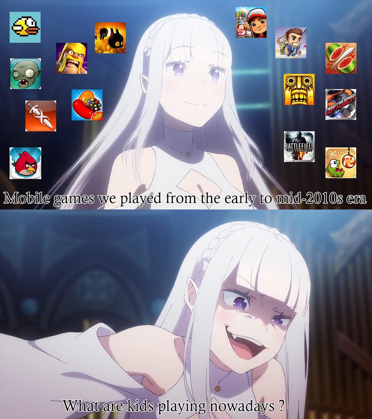 Remember These Games, nostalgia hits hard: classic mobile titles and memes from the early to mid-2010s. Viral meme using Re:Zero reaction template for relatable laughs.