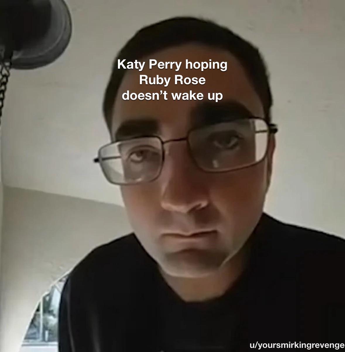 This meme features a man looking down into a camera with a serious expression, referencing pop culture speculation about Katy Perry and Ruby Rose.