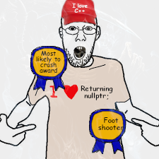 A C++ programmer soyjak wearing an I love C++ hat and shirt, proudly displaying awards for crashing programs and shooting himself in the foot with memes.
