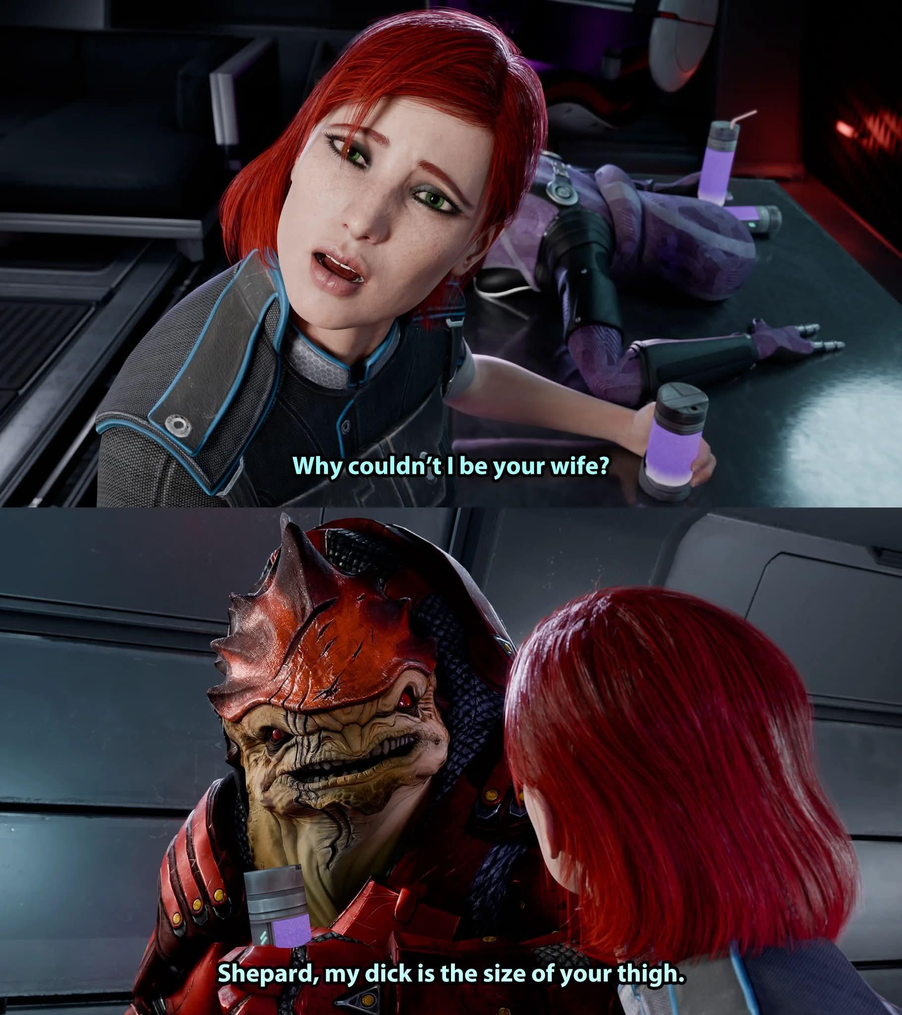 A funny Mass Effect meme featuring Commander Shepard asking Wrex a romantic question, only to receive a blunt and hilarious response about alien anatomy.