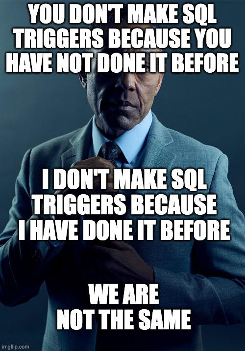 This TechMemes, DeveloperMemes, RelatableMemes meme features Text on image: You don't make SQL triggers because you have not done it before. I don't make SQL triggers because I have done it before. We are not the same.. Created and shared on Jart.lol, this image meme represents the best of internet culture and humor.
