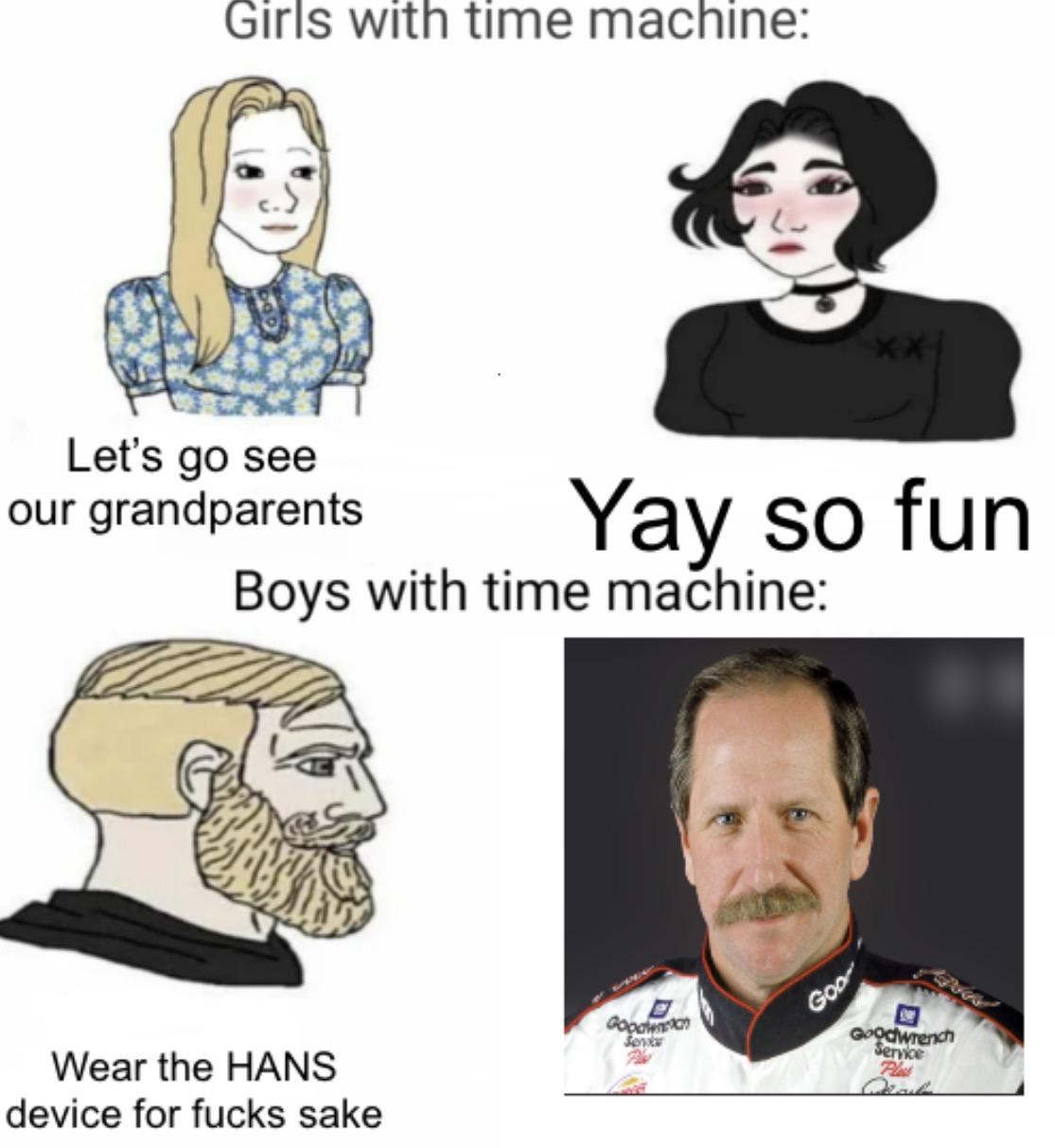 #funny #relatable #time machine #nascar #dale earnhardt #hans device #wojak #gender comparison #internet culture #racing memes #history humor #image macro